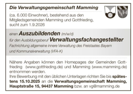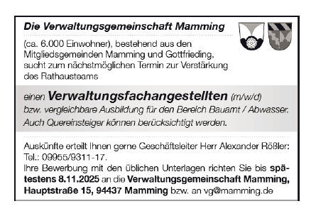 Bewerbungen schriftlich bis 15.10.2025 an die Verwaltungsgemeinschaft Mamming, Hauptstr. 15, 94437 Mamming oder per Email an vg@mamming.de