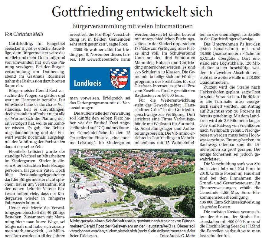 (19. Mai 2022; Dingolfinger Anzeiger) - Gottfrieding ist schuldenfrei – Gemeinde stellt ambitionierten Haushalt auf – positiver Blick in die Zukunft (PDF, 116,5 KB)