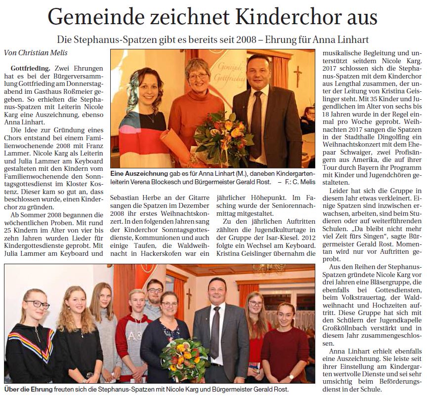 (04. Dezember 2023; Dingolfinger Anzeiger) - Würdigung erbrachter Leistungen – Gemeinde Gottfrieding ehrt Sportler, ehrenamtliche Kräfte und Gemeinderatsmitglied (PDF, 231,9 KB)